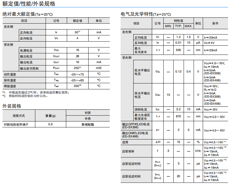 凹槽端子型(槽寬:3mm) ? 光電IC輸出(分為遮光時(shí)ON(EE-SX398)/入光時(shí)ON(EE-SX498) 2種類型) ? 適用電源電壓為DC4.5~16V ? 可直接連接C-MOS